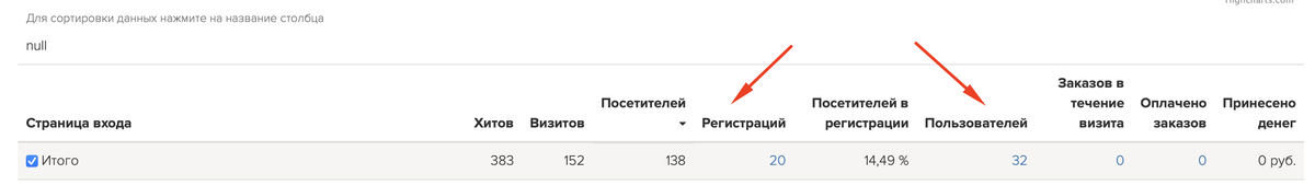 - Регистрации — новые пользователи проекта, которые зарегистрировались в форме на вашей странице