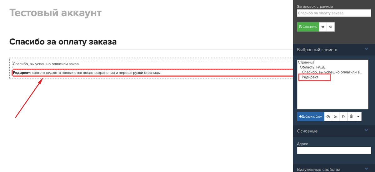 Если потребуется убрать блок Редиректа, аналогичным способом входим на страницу После успешной оплаты в режиме редактирования и удаляем блок, встав на него курсором.