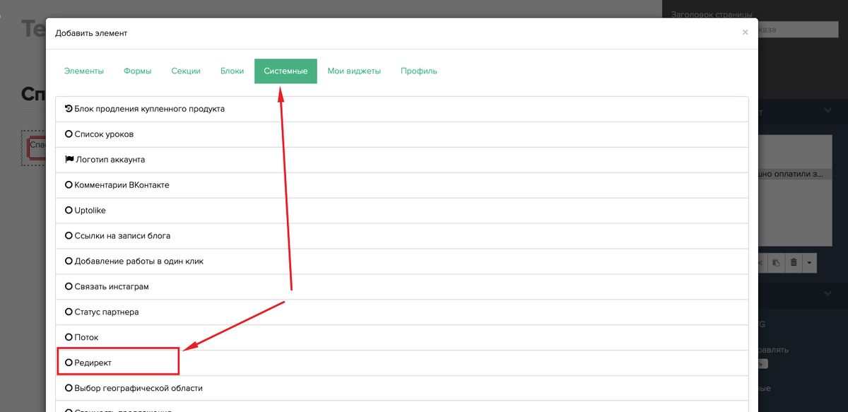Дальше во всплывающем окне на вкладке «Системные» выбираем блок «Редирект»