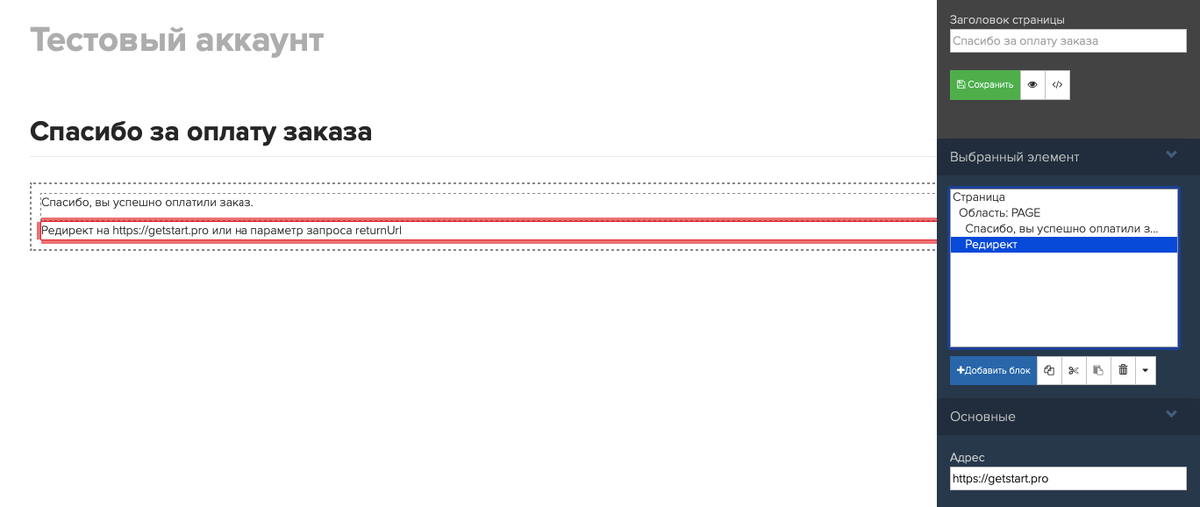 Теперь нас интересует поле блока "Адрес". Давайте добавим туда заранее приготовленную ссылку с красивой страницей после оплаты: